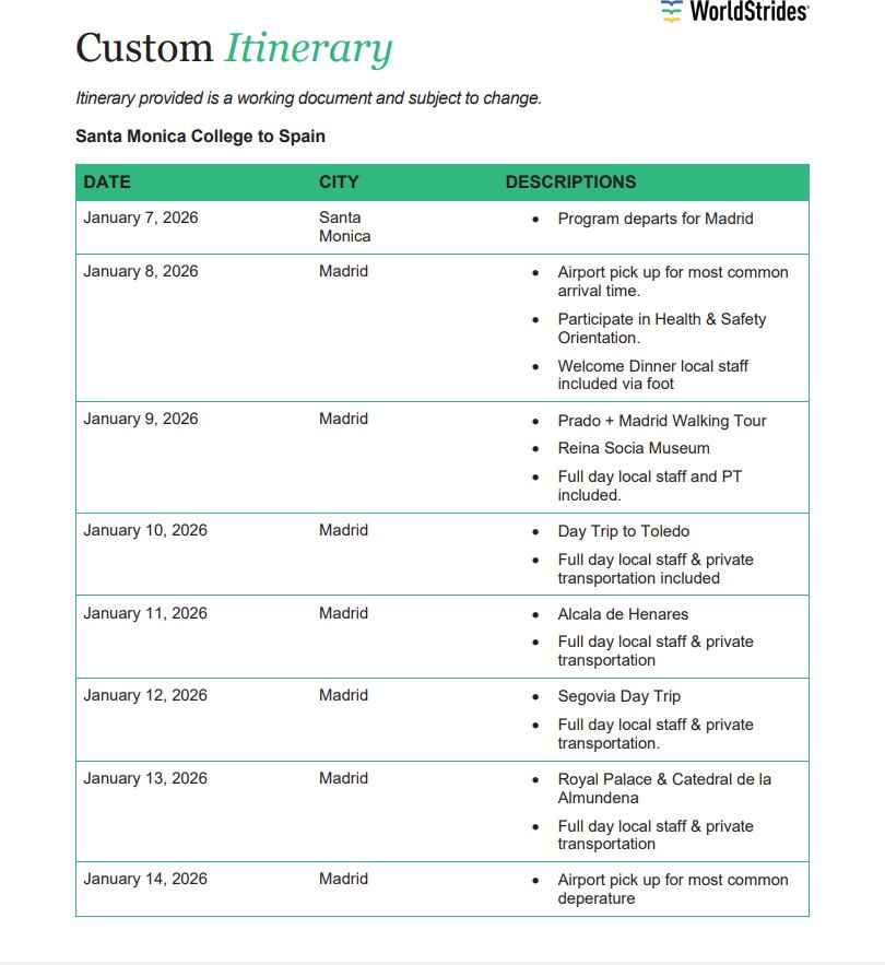 *Cost: $1,921 per person, does not include flight to/from Madrid, ground transportation to/from airports, class fees for Global Studies 35, lunch and dinner. Breakfast is included.
